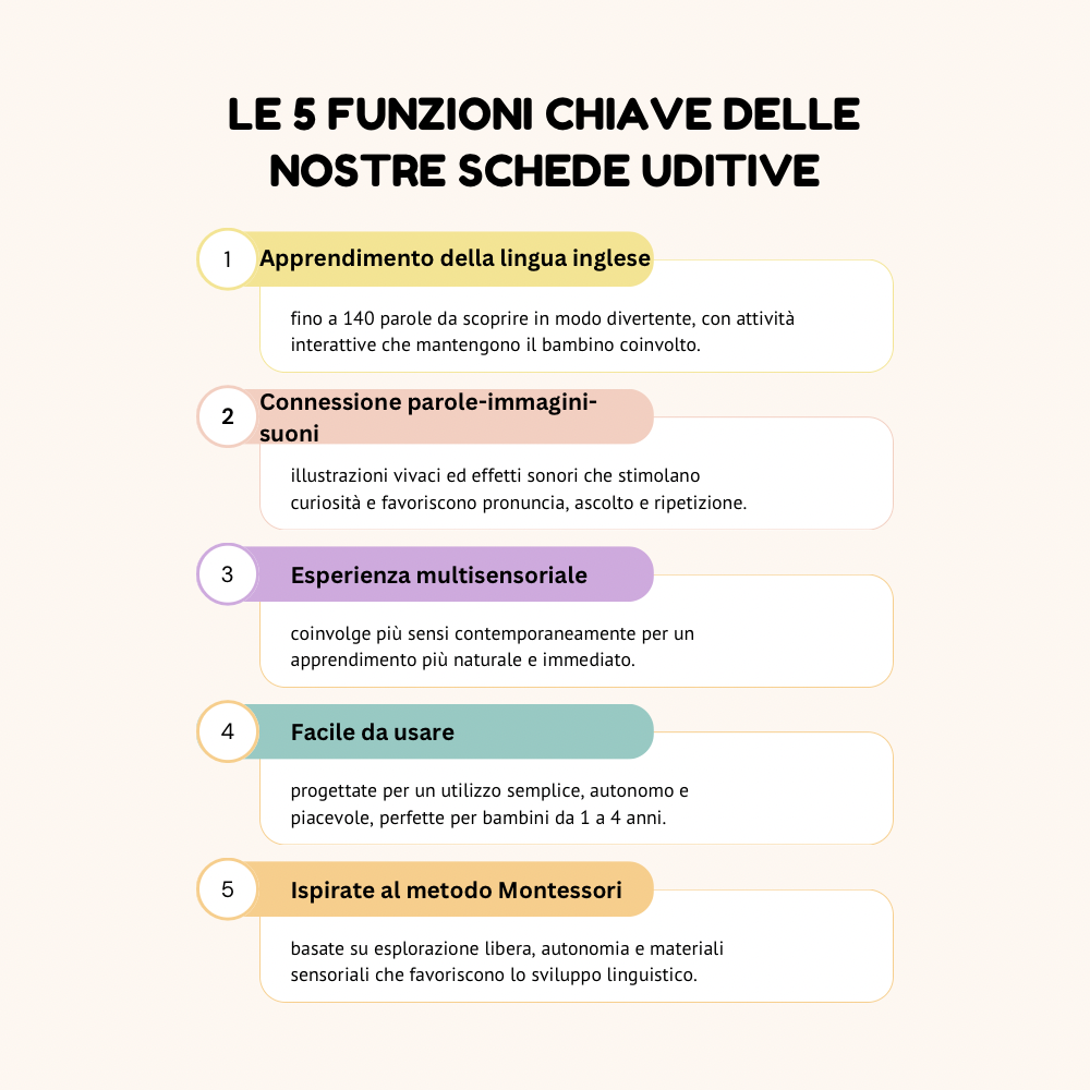 Con le nostre schede uditive, il tuo bambino non passerà più le giornate con il viso incollato allo schermo. Finalmente un’attività che cattura davvero la sua attenzione: creativa, educativo e divertente. Niente luce blu, solo gioco reale, concentrazione e istruzione.
